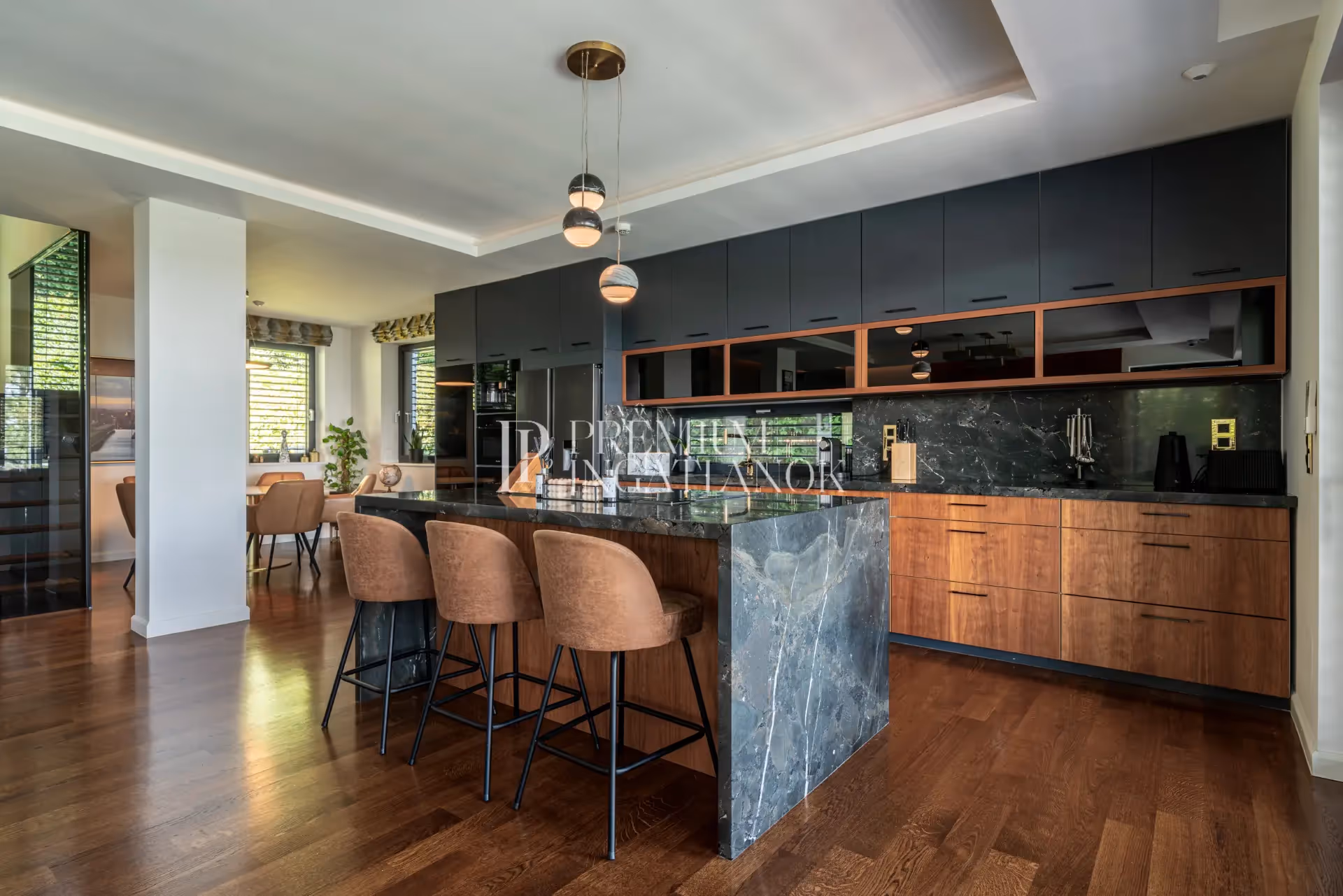 Egyedi konyhabútor, olasz természetes kőburkolattal (5 cm), Miele konyhagépekkel, nagyméretű konyhaszigettel