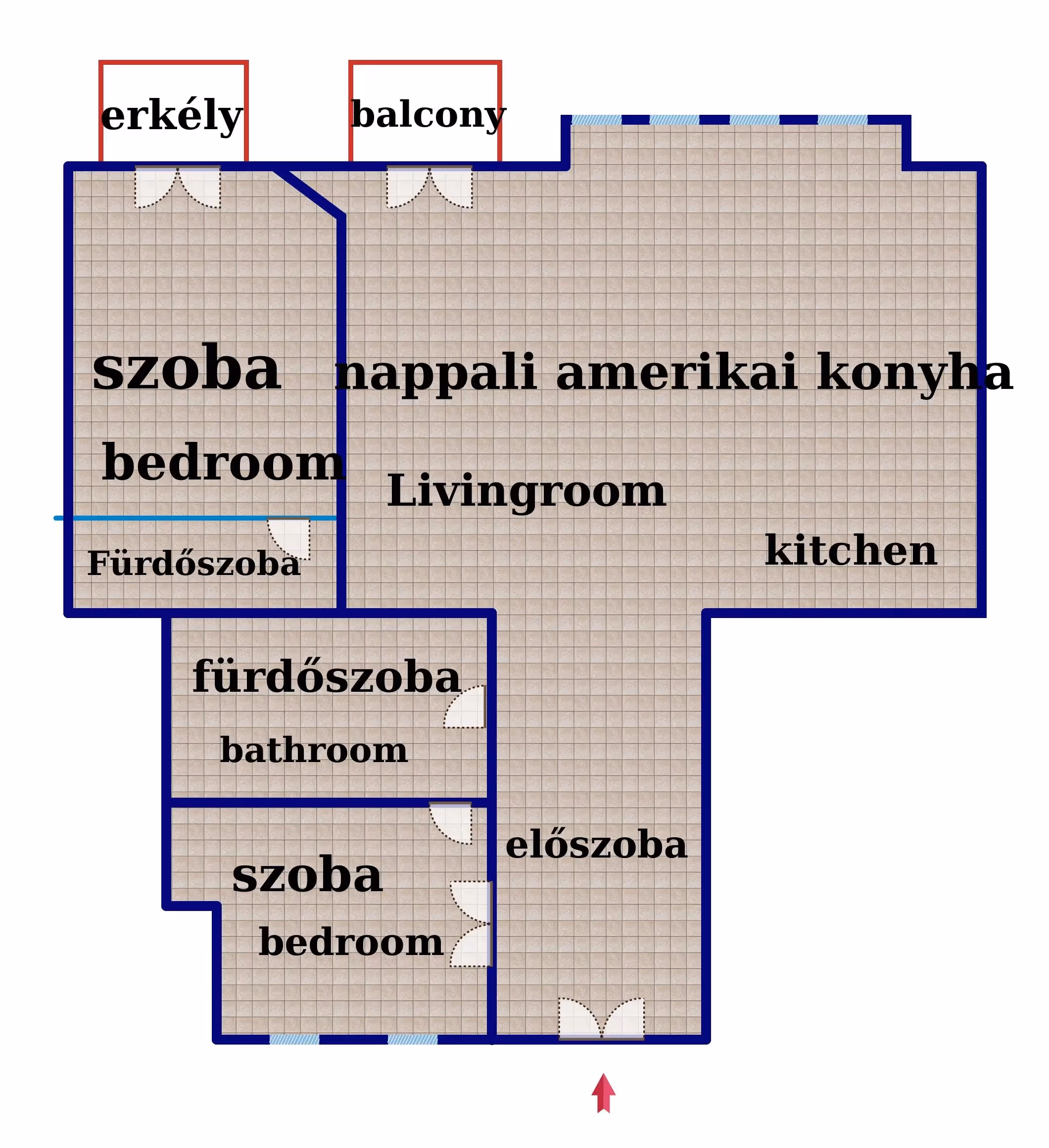 Amerikai konyhás nappali 2 hálószoba , 2 fürdőszoba, 2 erkély.