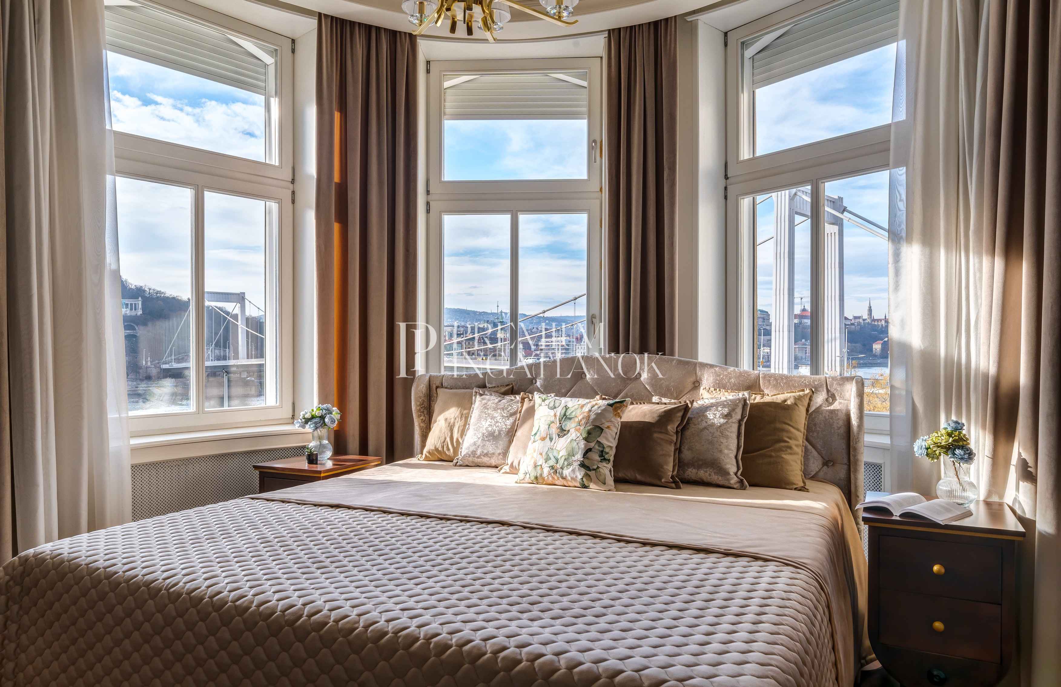 Eladóvá vált a Belgrád rakpart egyik legrégebbi, ikonikus épületében található, extra 246 nm-es, nagypolgári, Dunára és Gellért-hegyre panorámás, luxus, négy hálószobás, 3 fürdőszobás, nagyívű eleganciával megálmodott és kivitelezett art deco stílusú gyönyörű lakás.