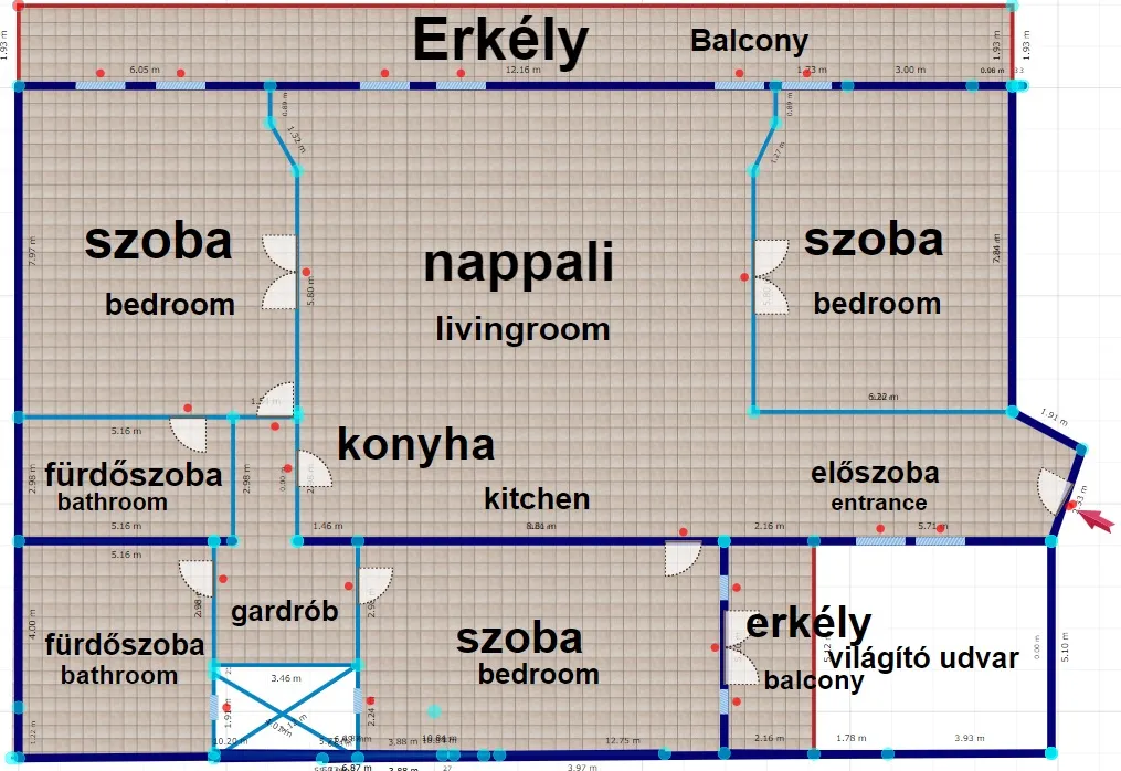 Amerikai konyhás nappali 3 hálószoba , 2 fürdőszoba, gardrób, 2 erkély.