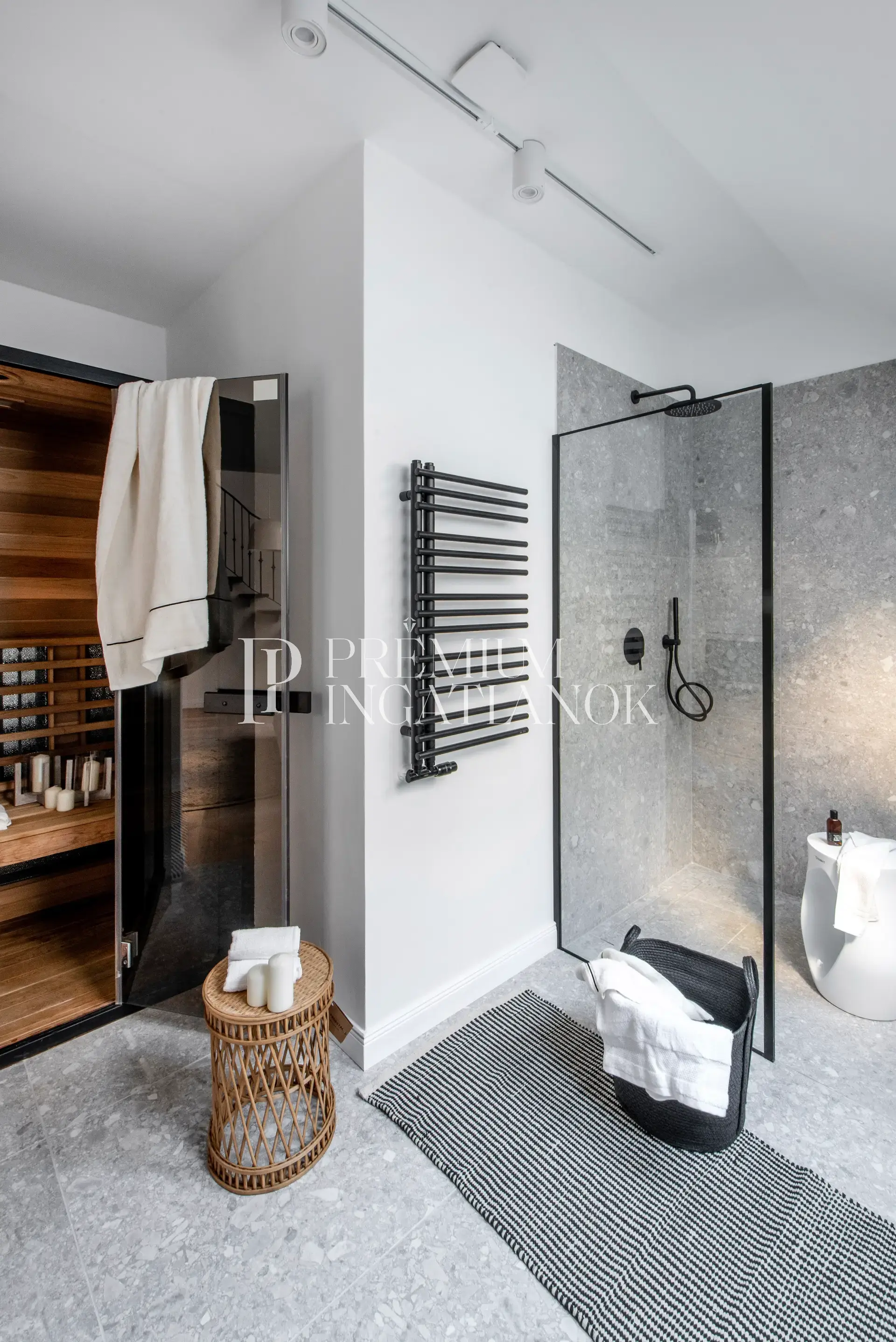 Anyaghasználat: Egyedi tervezésű intarzia parketta, designer olasz burkolatok és prémium szaniterek (pl. Alessi) dominálnak.