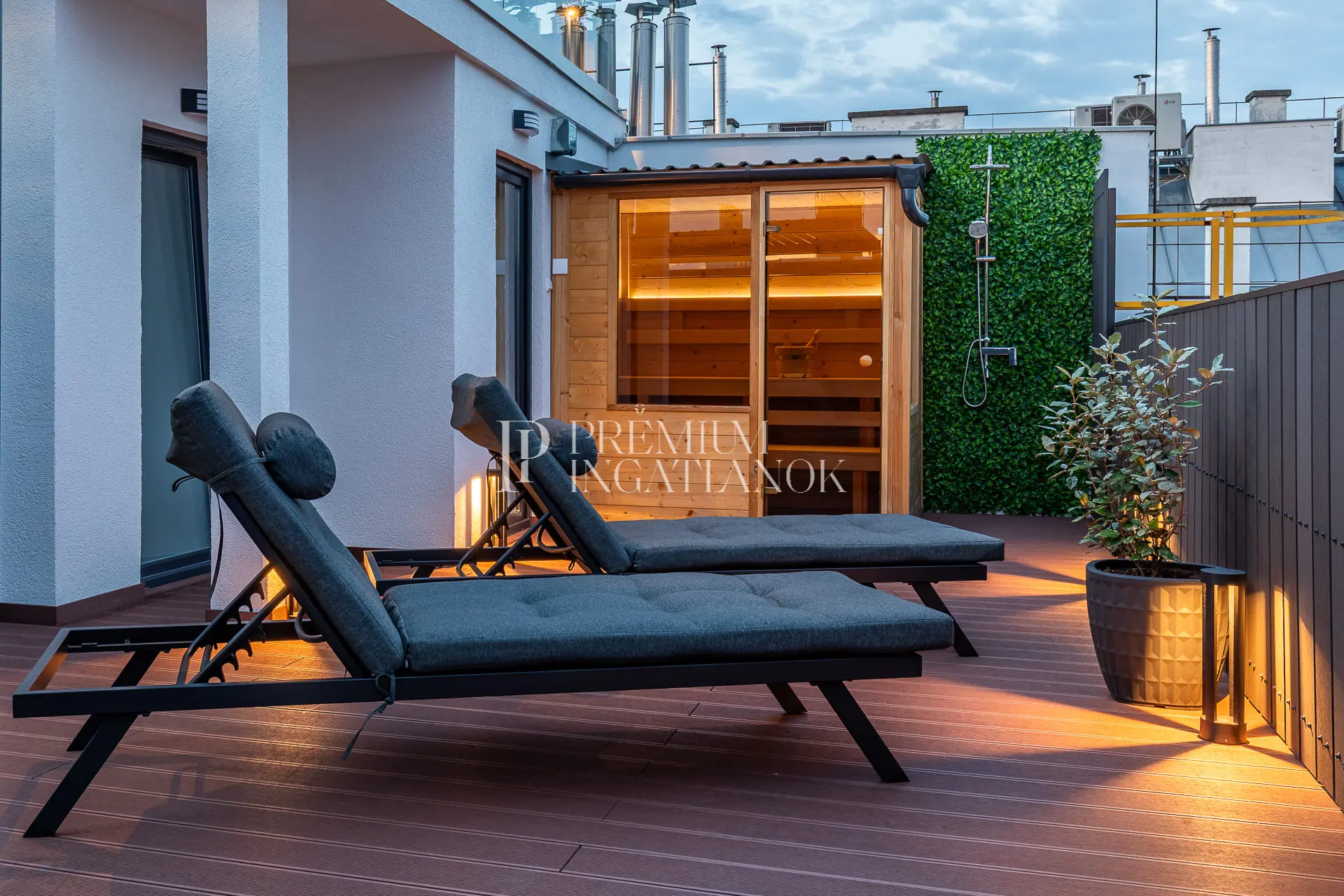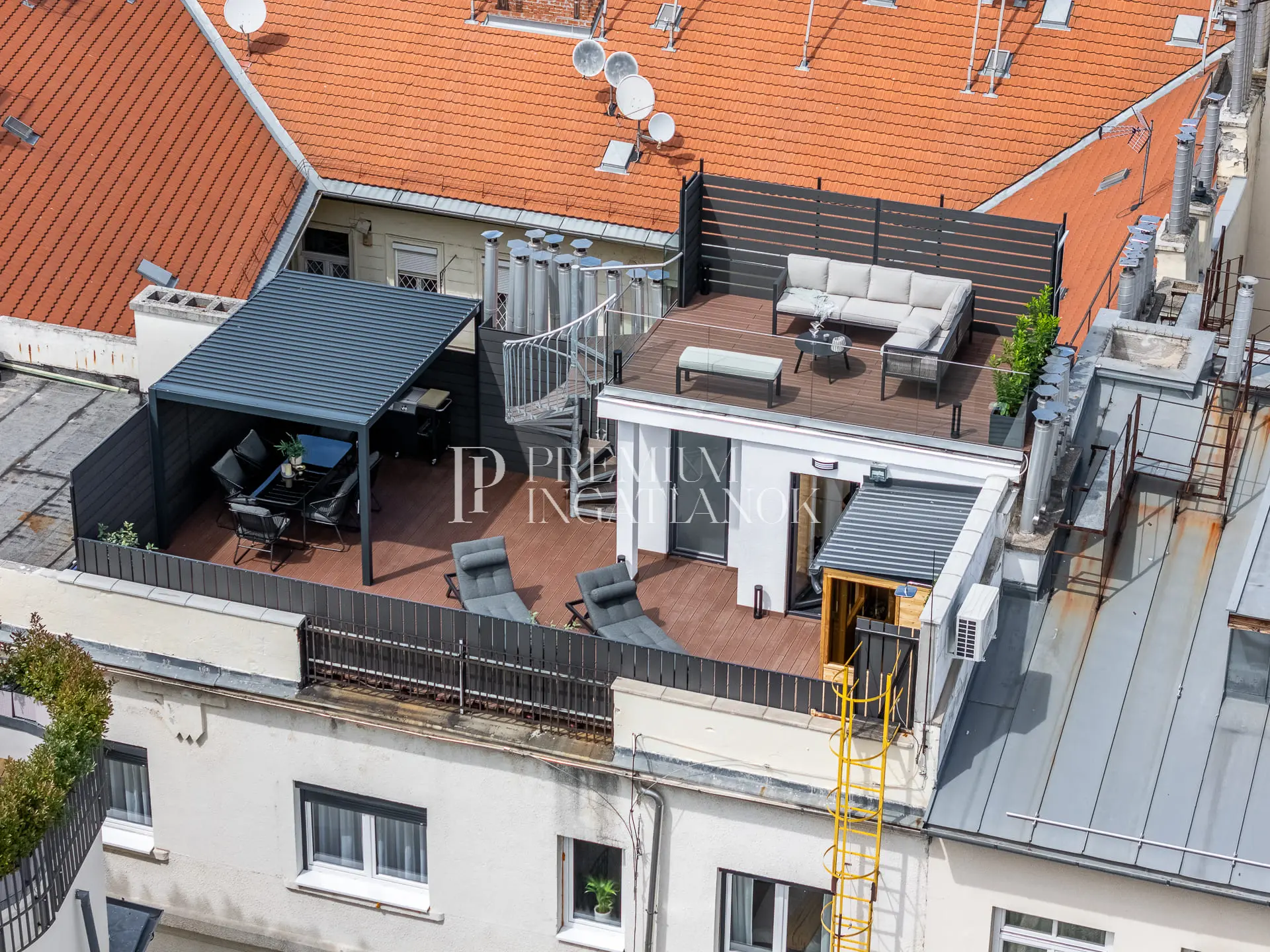 Kivételes lehetőség várja új tulajdonosát Budapest egyik legimpozánsabb pontján! Ez a 84 m²-es, prémium minőségben felújított lakás a méltán híres Falk Miksa utcában található, ahol a galériák, antikvitás üzletek és elegáns kávézók különleges hangulatot árasztanak. Néhány lépésre a Duna-part, a Parlament és a belváros legjobb éttermei ennél központibb és exkluzívabb lokációt nehéz találni.Az ingatlan igazi ékköve a 62 m²-es, kétszintes panorámaterasz. A felső, 15 m²-es szintre csigalépcső vezet, ahonnan Budapest egyik legszebb körpanorámája tárul elénk: a Parlament, a Budai Vár, a Citadella, a Halászbástya és a Bazilika mind egyetlen pillantással látható. Az alsó teraszon kültéri konyha, privát szauna és praktikus tárolóhelyiség teszi teljessé az élményt.A belső terek minden részlete átgondolt tervezés eredménye a harmonikus belsőépítészeti megoldások és a minőségi anyaghasználat eleganciát és otthonosságot sugároznak. A fűtést és hűtést hűtő-fűtő klímák, valamint padlófűtés biztosítja a konyhában és a fürdőszobában.