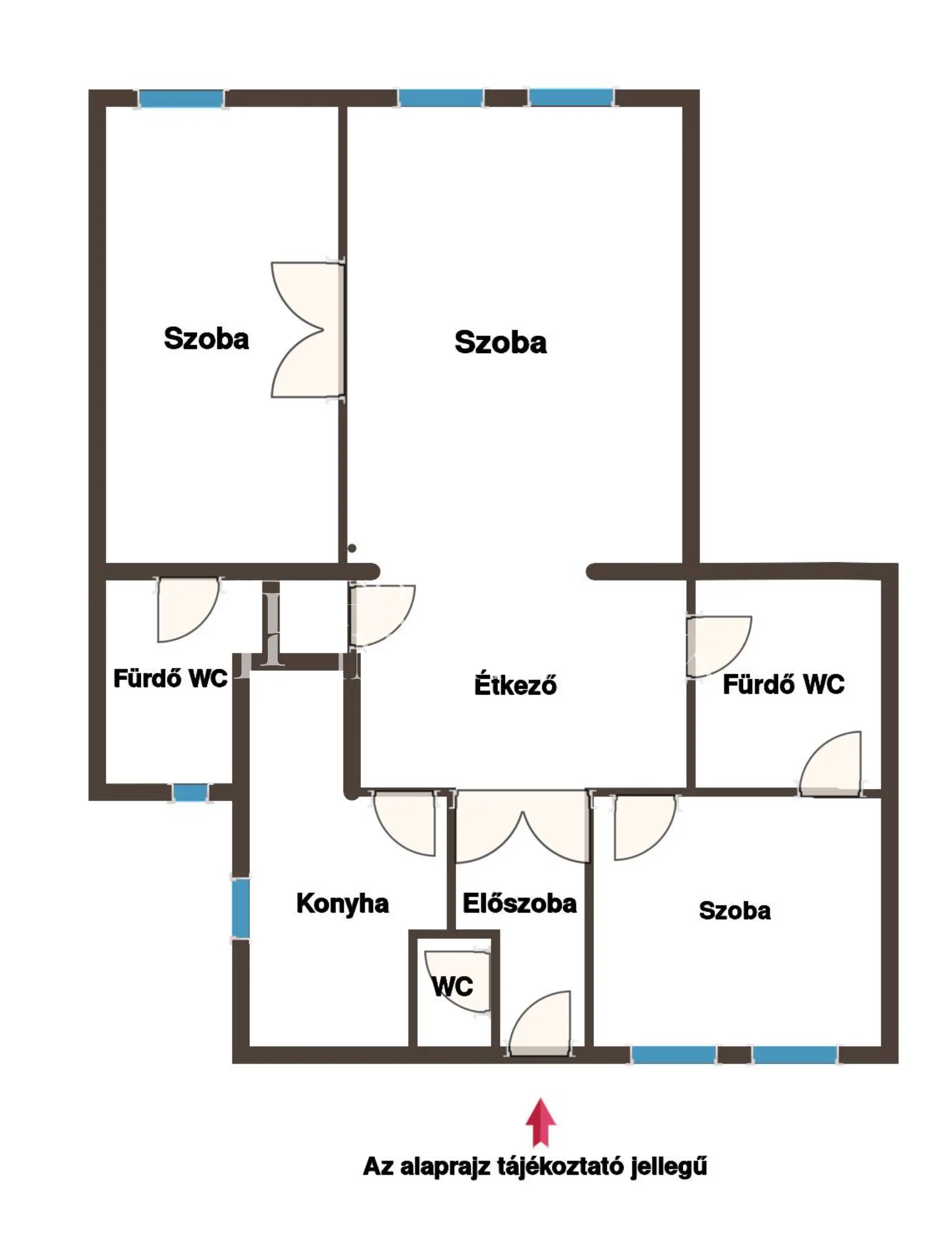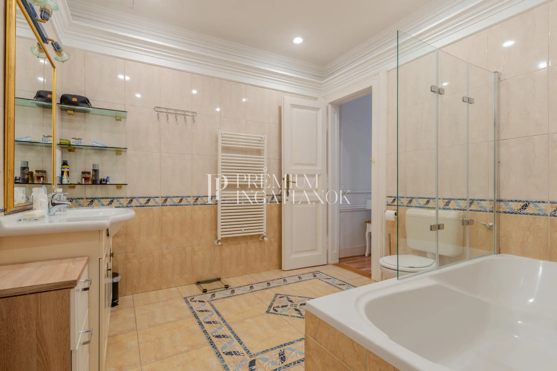 A második emeleten lévő lakás kiváló elosztású: tágas előtér, nagy étkező harmonikaajtóval a nappaliba, két hálószoba, két fürdőszoba és 3 WC biztosítja a kényelmet.A hatalmas belmagasság, a klasszikus stukkódíszítés, az eredeti történelmi fa nyílászárók ,spaletták ,és a világos, utcai ablakok egyedülálló nagypolgári hangulatot teremtenek.A fűtés gáz cirkó. Riasztó,és légkondicionáló van.