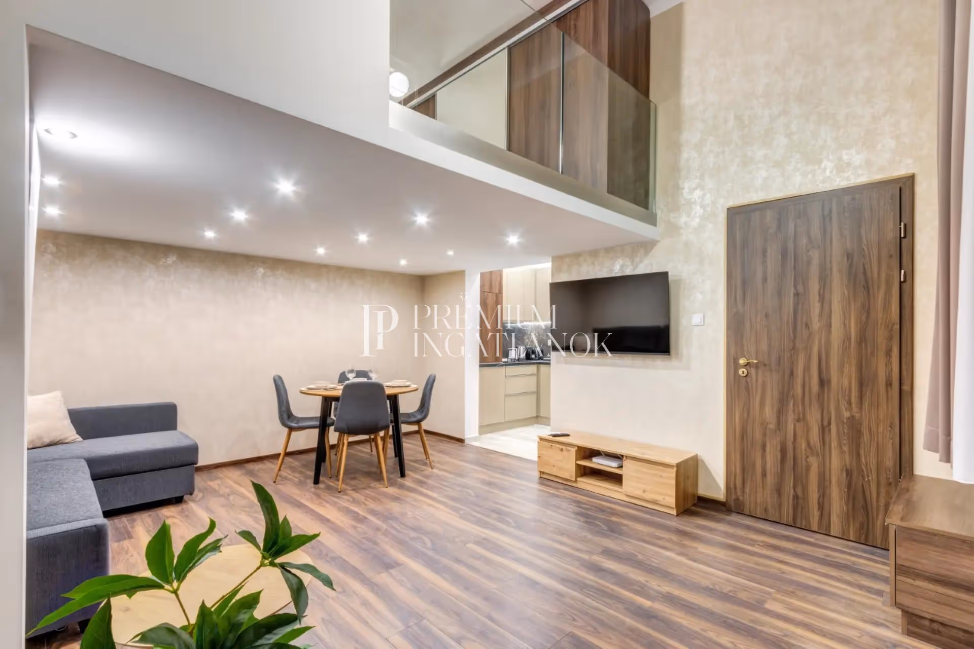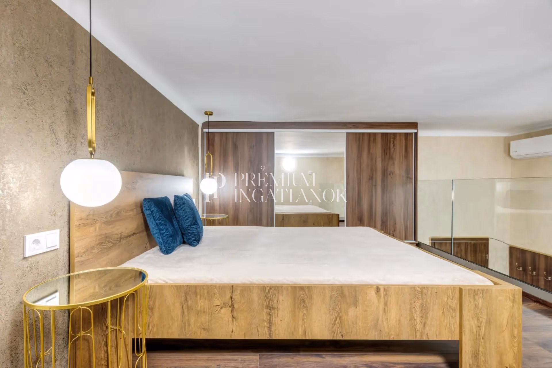 The second, slightly more spacious 42 sqm apartment (30 sqm floor area + 12 sqm mezzanine) represents the same uncompromising, exclusive standard. It is worth pausing here for a moment to note a rare treasure in the market of loft apartments: the ceiling height above the mezzanines reaches a comfortable 2 meters! This is not just a sleeping nook, but a genuine, livable space, bringing the combined true usable floor area of the two properties to an impressive 92 square meters. Underfoot, electric underfloor heating provides a pleasant thermal sensation, while modern inverter air conditioners on the walls ensure a perfect climate—all alongside incredibly low, optimized maintenance costs.