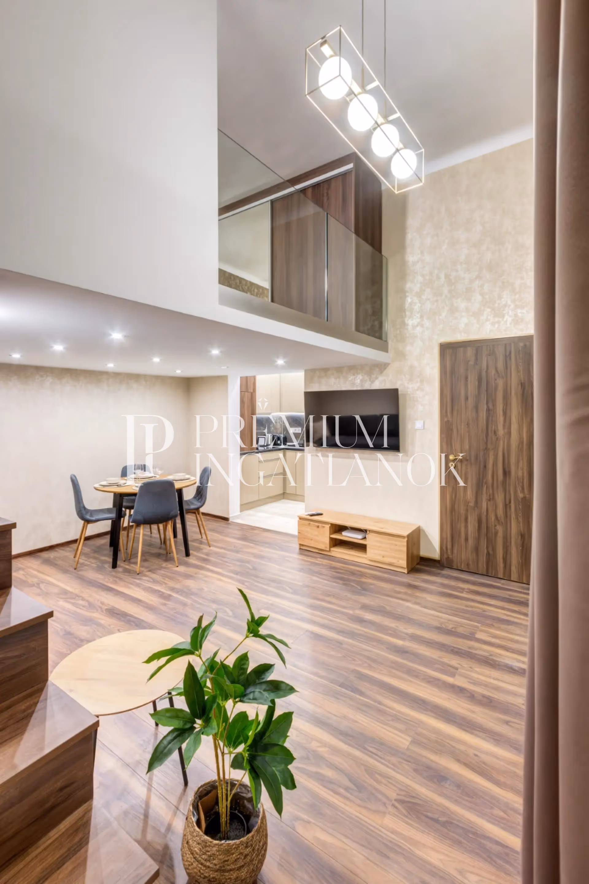 Stepping into the first, 35 sqm living space (26 sqm floor area + 9 sqm mezzanine), you are immediately struck by a sense of premium quality and meticulous design. In this space, conceptualized by an interior designer, every millimeter is in its perfect place. The custom-built, sleek, fully equipped kitchen and the magazine-worthy furnishings create a perfect harmony—and best of all, this is all included in the purchase price.