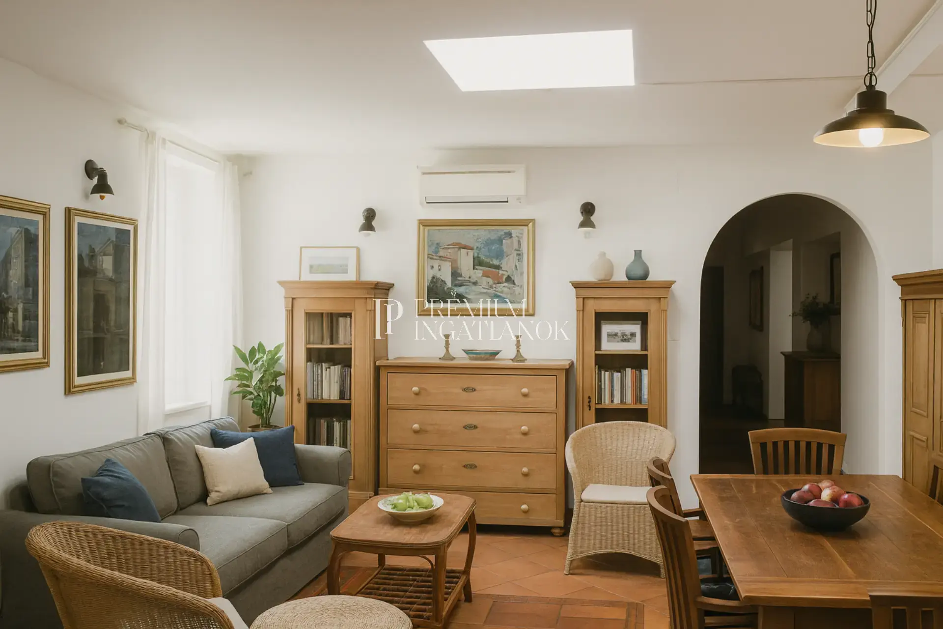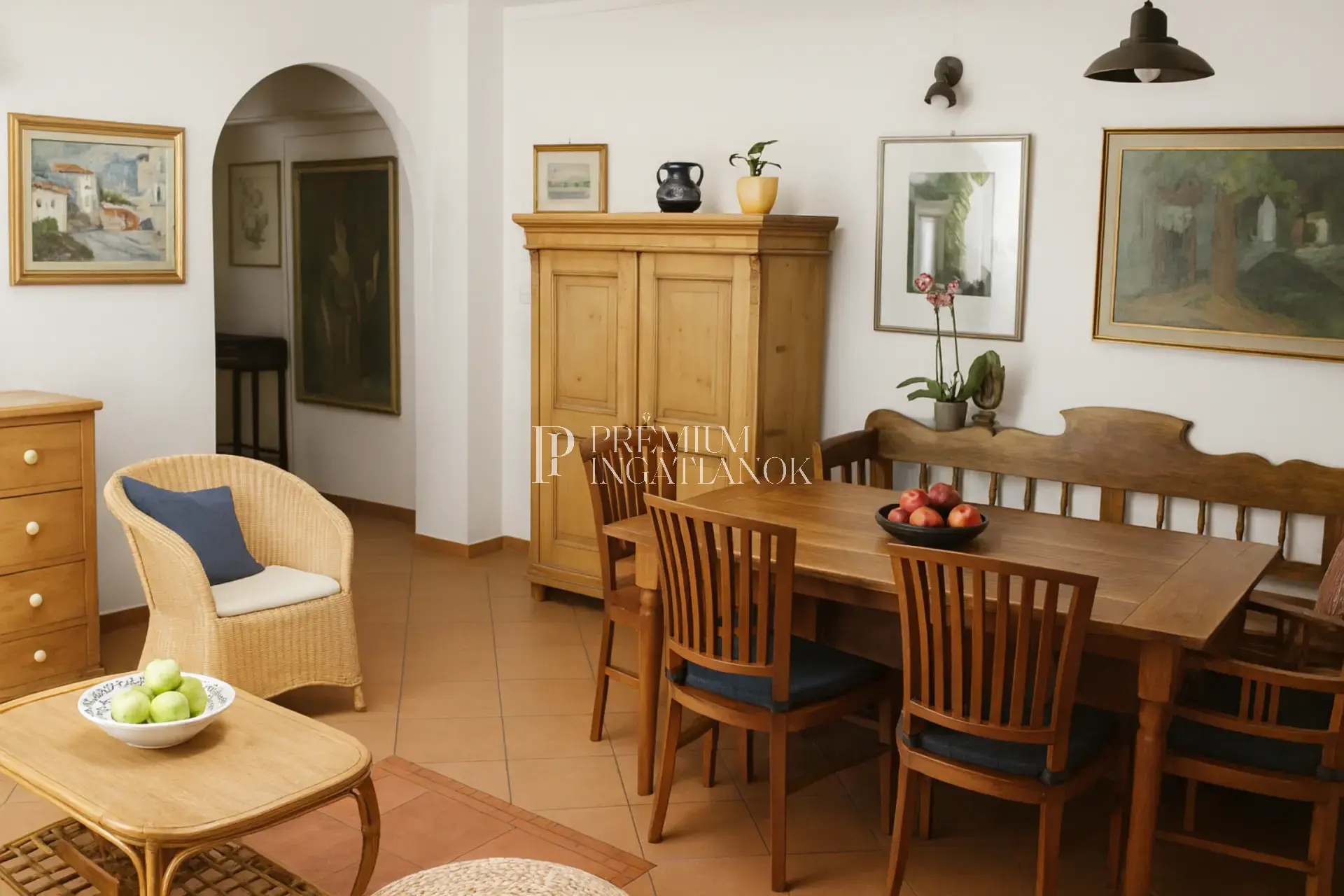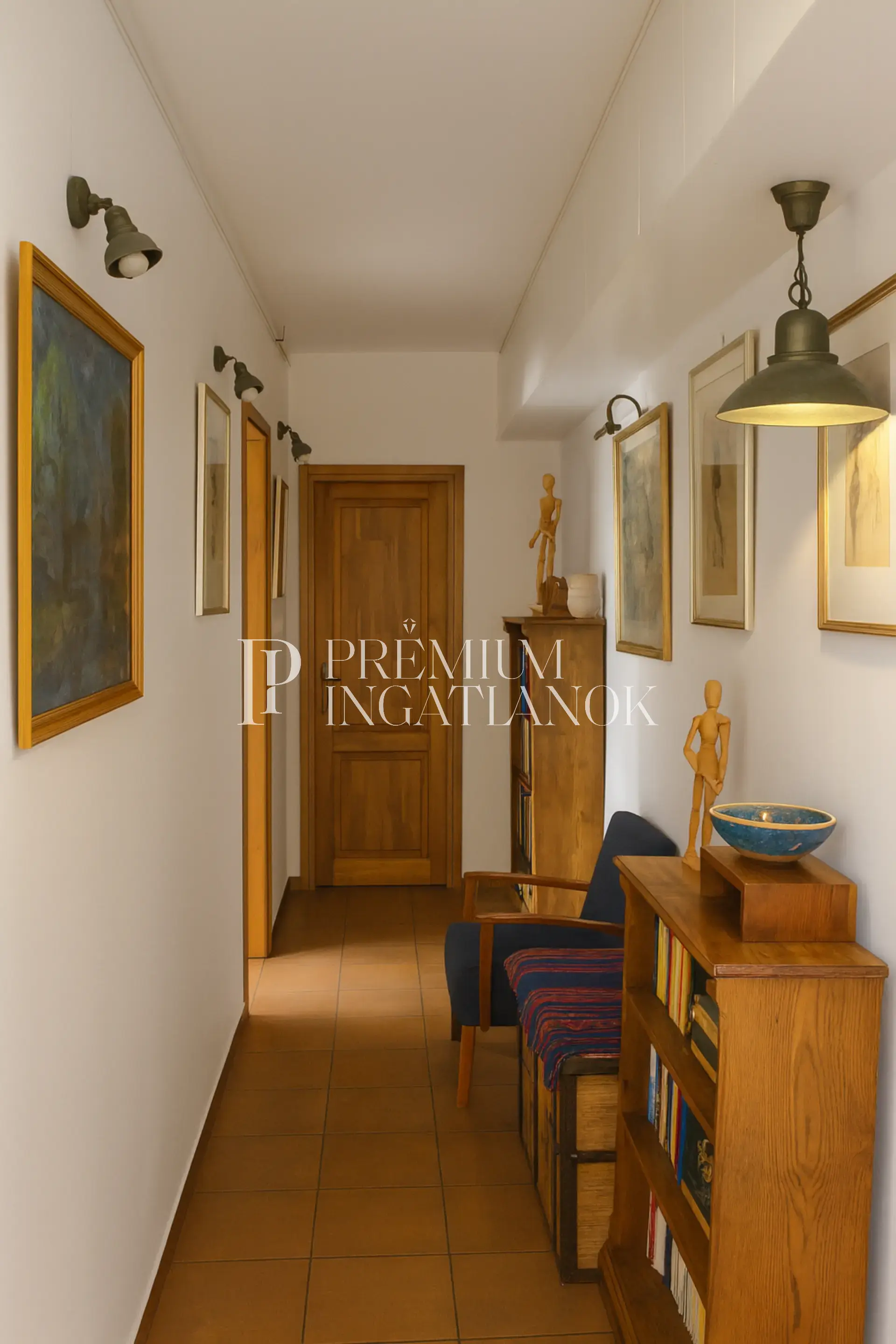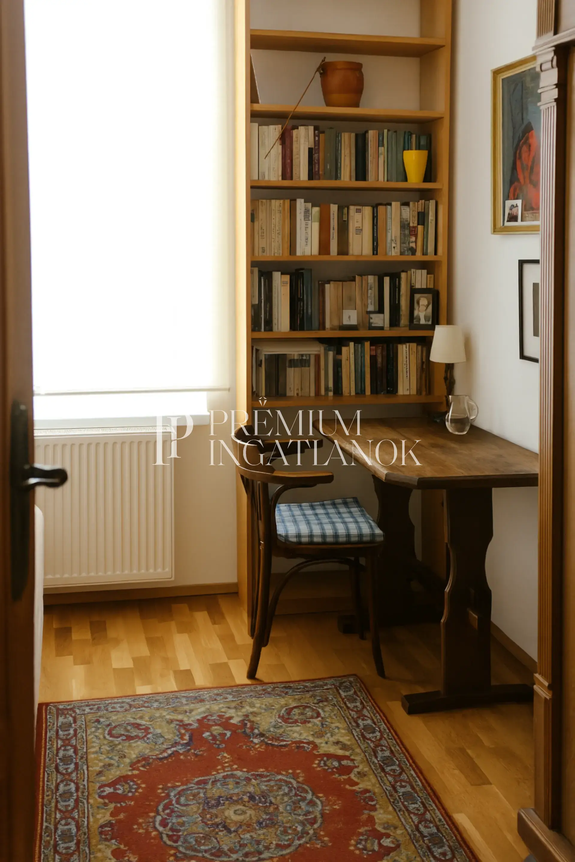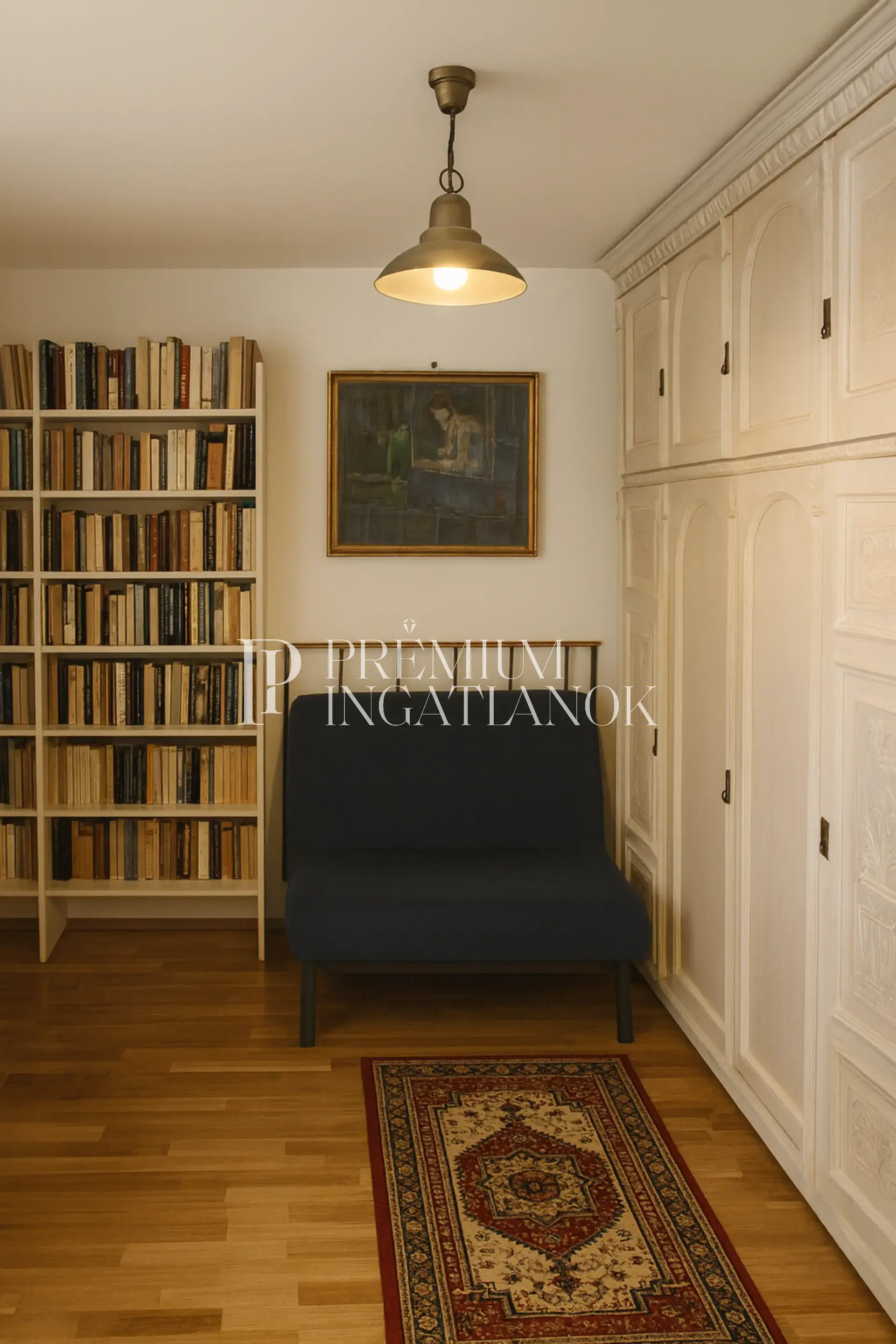 Az ingatlan egy századfordulós épület tetején, 2017-es ráépítéssel jött létre, így ötvözi a klasszikus belvárosi környezet hangulatát a modern műszaki tartalommal. A ház kívül-belül megújult, új lift került beépítésre, a lakás pedig világos, napfényes és csendes – a belső udvari tájolásnak köszönhetően.