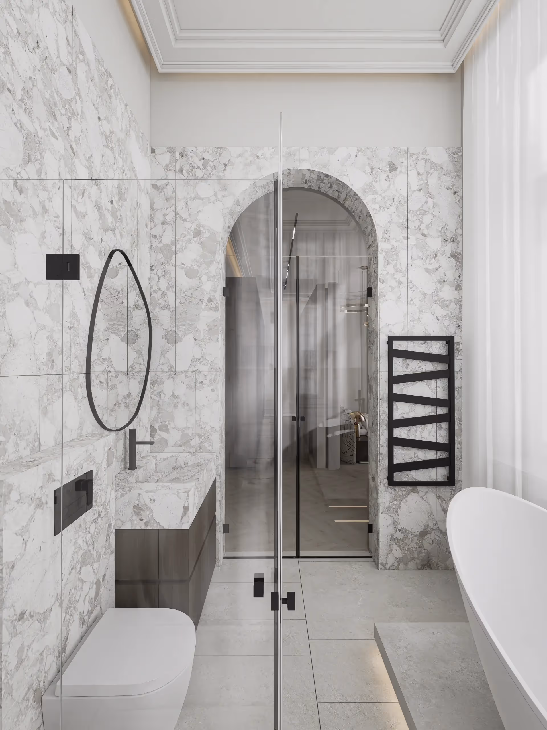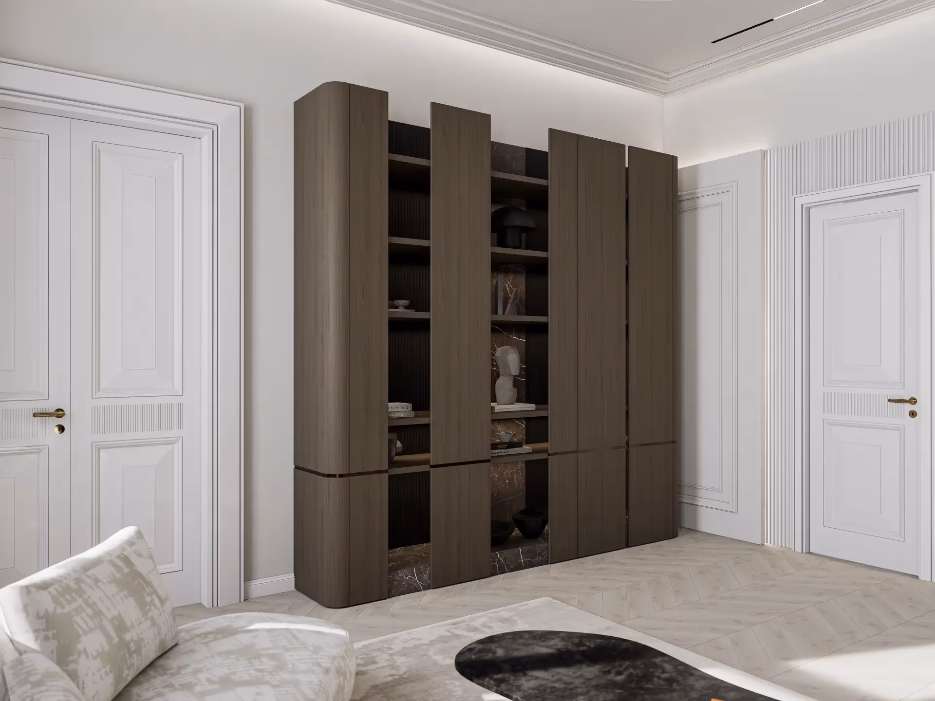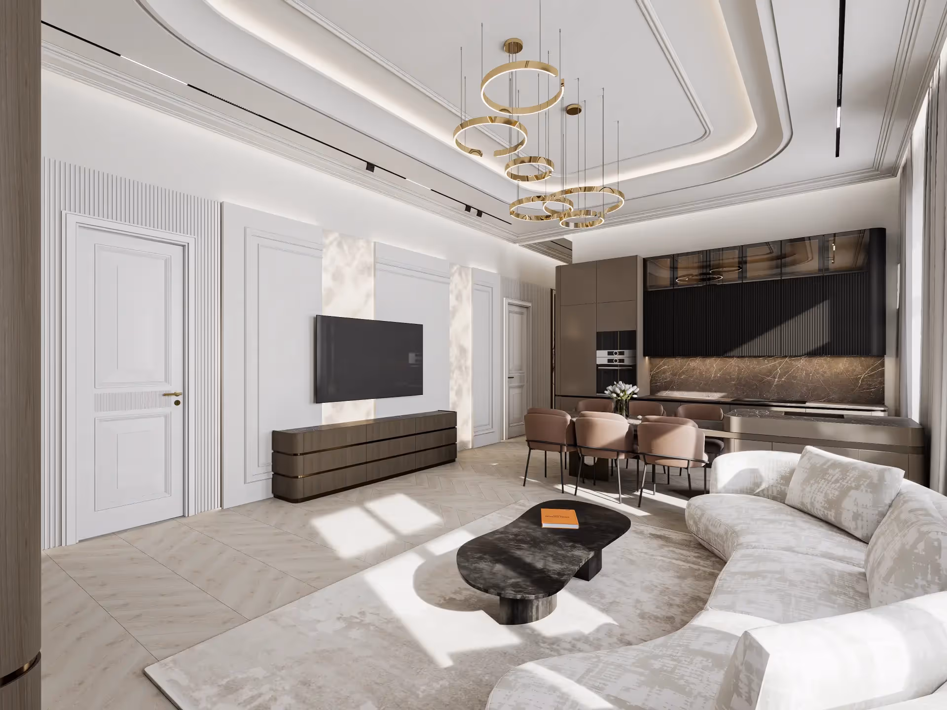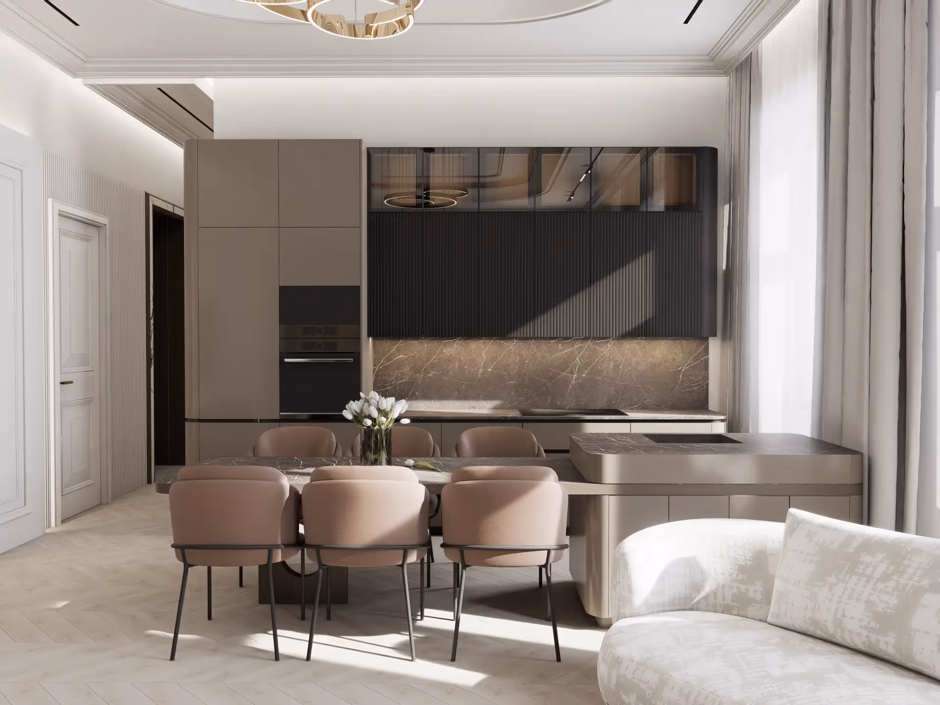 A lakás teljes bútorzattal és gépesítéssel kerül átadásra. Minden elem egymásra építve, koncepció mentén készül — nem összeválogatott darabokból, hanem egységes enteriőrként.