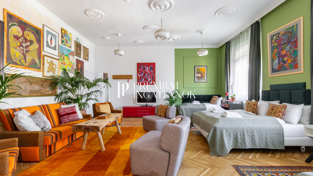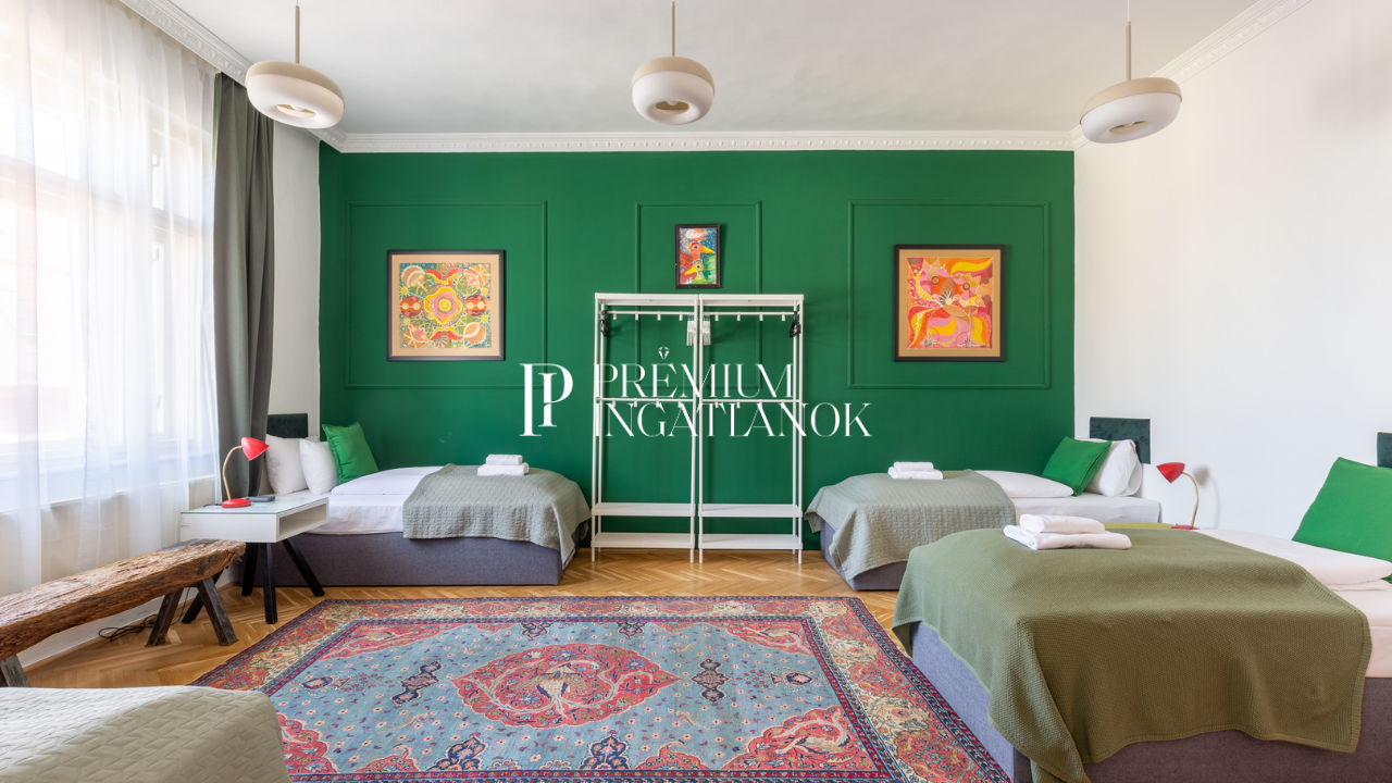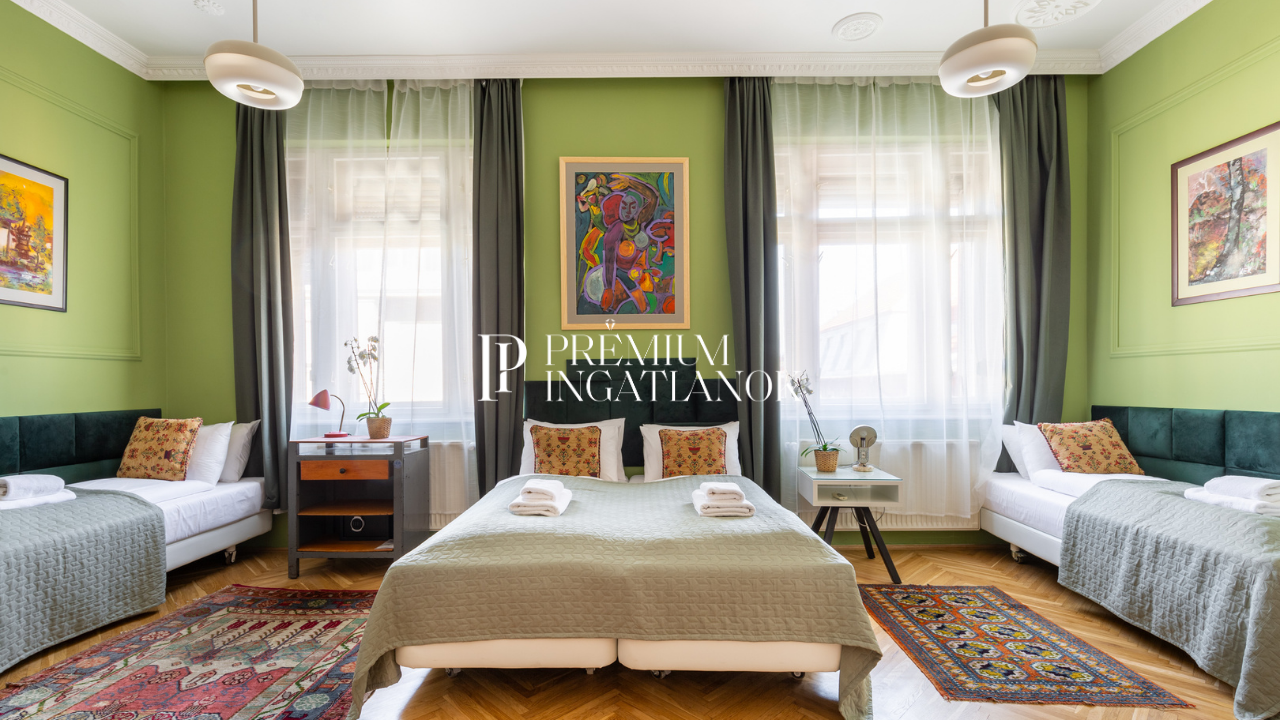 Sokoldalú felhasználási lehetőségek: Az ingatlan jelenleg szálláshelyként üzemel 4 apartmannal, ami azonnali bevételi forrást jelenthet rövid távú kiadásban gondolkodó befektetőknek. Korábban ügyvédi iroda működött itt, ami bizonyítja, hogy az ingatlan irodai célra is tökéletesen alkalmas elegáns belmagasságú terei és reprezentatív elhelyezkedése ideális egy cégközpont vagy rendelő számára. A 310 cm-es belmagasság és a napfényes, délkeleti tájolású szobák kellemes, tágas légkört teremtenek, legyen szó irodai munkáról vagy vendégek fogadásáról. A 5 szoba és 4 fürdőszoba kialakítása lehetővé teszi akár több külön lakásra történő felosztását, vagy éppen egy közösségi szálláshely (pl. hostel) létrehozását is. Az ingatlan jogi státusza rendezett, így mind irodaként, mind szálláshelyként való hasznosítása lehetséges hivatalosan is.