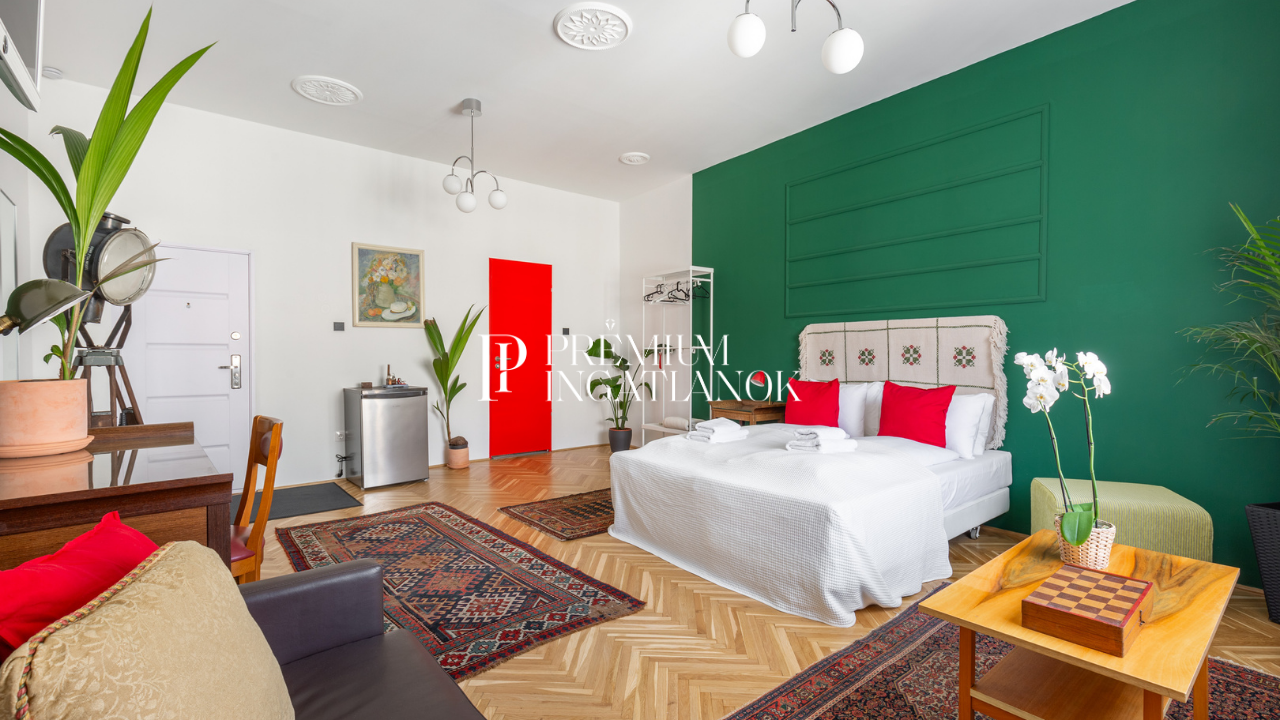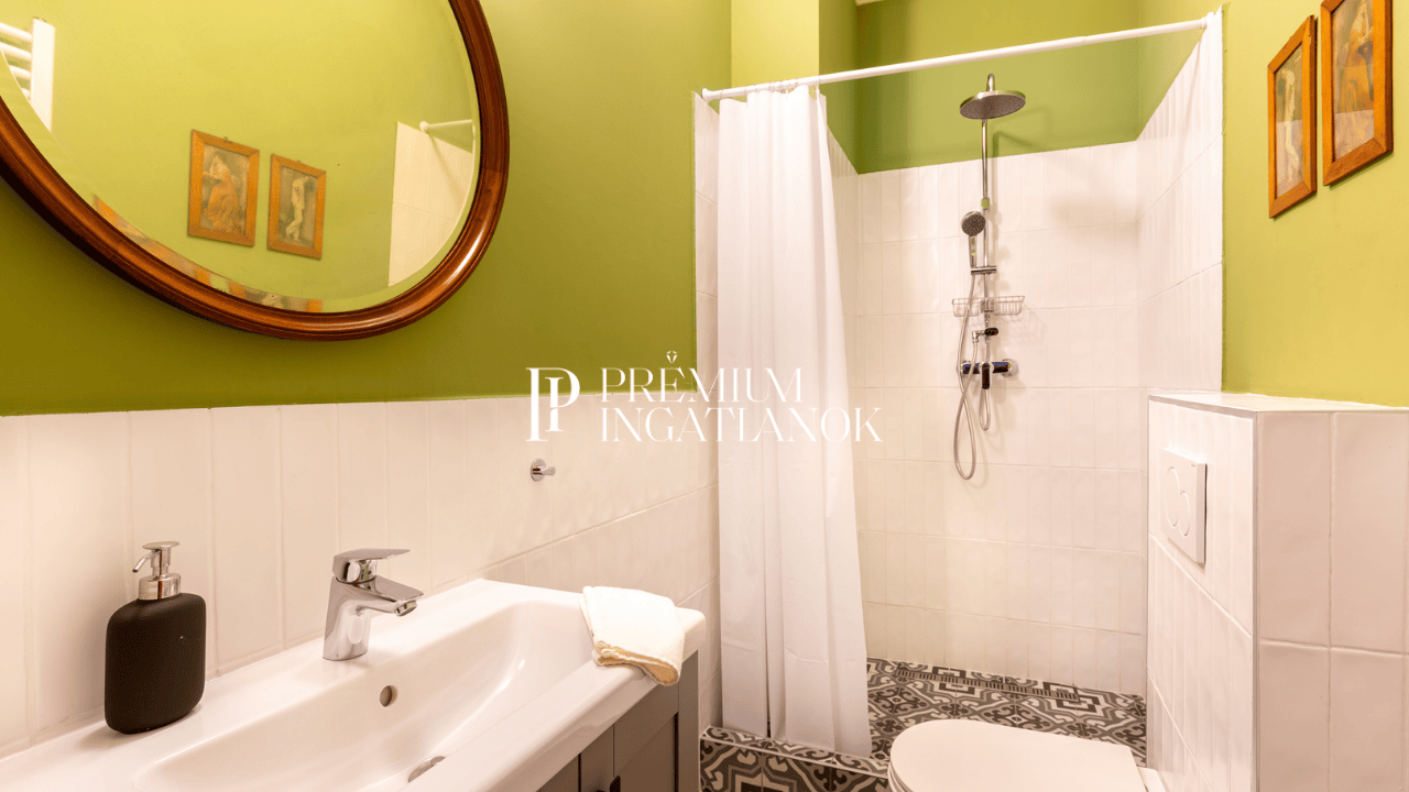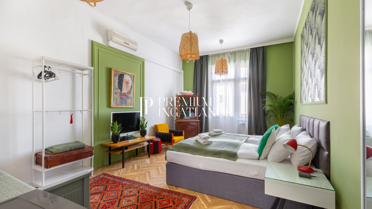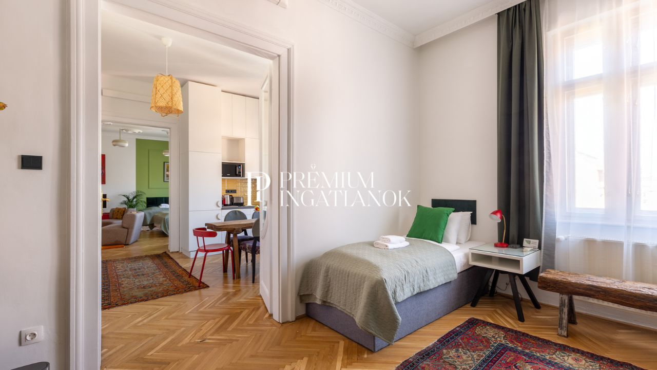 Sokoldalú felhasználási lehetőségek: Az ingatlan jelenleg szálláshelyként üzemel 4 apartmannal, ami azonnali bevételi forrást jelenthet rövid távú kiadásban gondolkodó befektetőknek. Korábban ügyvédi iroda működött itt, ami bizonyítja, hogy az ingatlan irodai célra is tökéletesen alkalmas elegáns belmagasságú terei és reprezentatív elhelyezkedése ideális egy cégközpont vagy rendelő számára. A 310 cm-es belmagasság és a napfényes, délkeleti tájolású szobák kellemes, tágas légkört teremtenek, legyen szó irodai munkáról vagy vendégek fogadásáról. A 5 szoba és 4 fürdőszoba kialakítása lehetővé teszi akár több külön lakásra történő felosztását, vagy éppen egy közösségi szálláshely (pl. hostel) létrehozását is. Az ingatlan jogi státusza rendezett, így mind irodaként, mind szálláshelyként való hasznosítása lehetséges hivatalosan is.