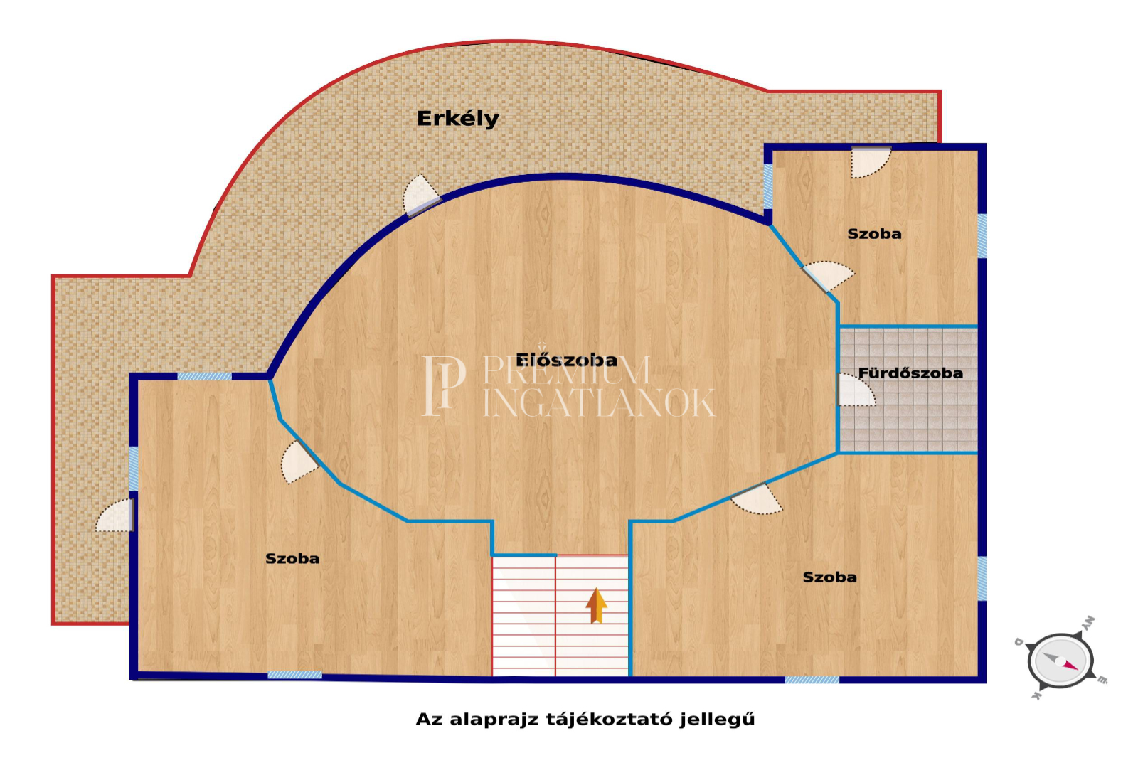 A földszinten 85 m2-es teraszra tudunk kijutni, ahol csodás panoráma tárul elénk, szintén itt találjuk a tágas nappalit amely hatalmas ablakaival napfényes és barátságos teret kínál.
