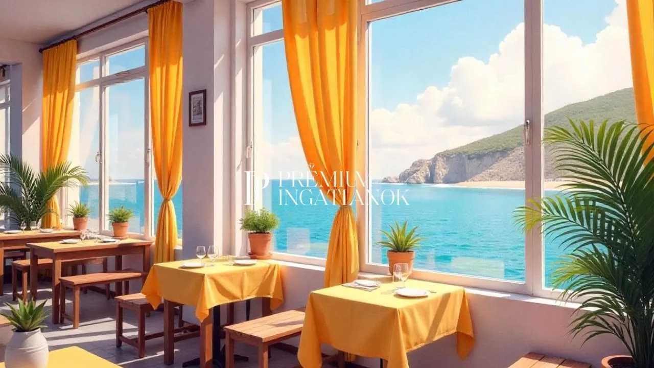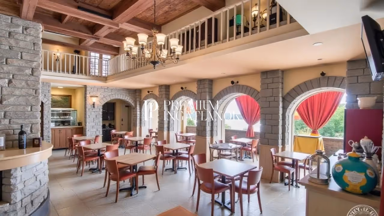 A konyhához tartozik egy hűtő és egy fagyasztó kamra is (3 és 5 m3), a főépület alatt van egy kb. 70 m2 alapterületű pince is, így a főépület 3 szinten mintegy 715 m2 hasznos alapterületű.Az étteremben található egy különleges hő-lég befúvásos 37 KW teljesítményű kovácsolt vas kandalló is, mely télen gyönyörű látványpontja az étteremnek. Az egyedi és különleges bárpult is homokkövezett és tükrös, nagyon lenyűgöző látványt nyújt az esti fényben is.Szállodai rész, szobák:Jelenleg egy 11 – szobás, csodálatos panorámás (7 db kétágyas illetve franciaágyas 2db háromágyas és 2 db négyágyas szoba - 28 főre ) szállodai rész ( emeleti szint ), + 1 db különleges kétszemélyes apartman tartozik az épülethez.