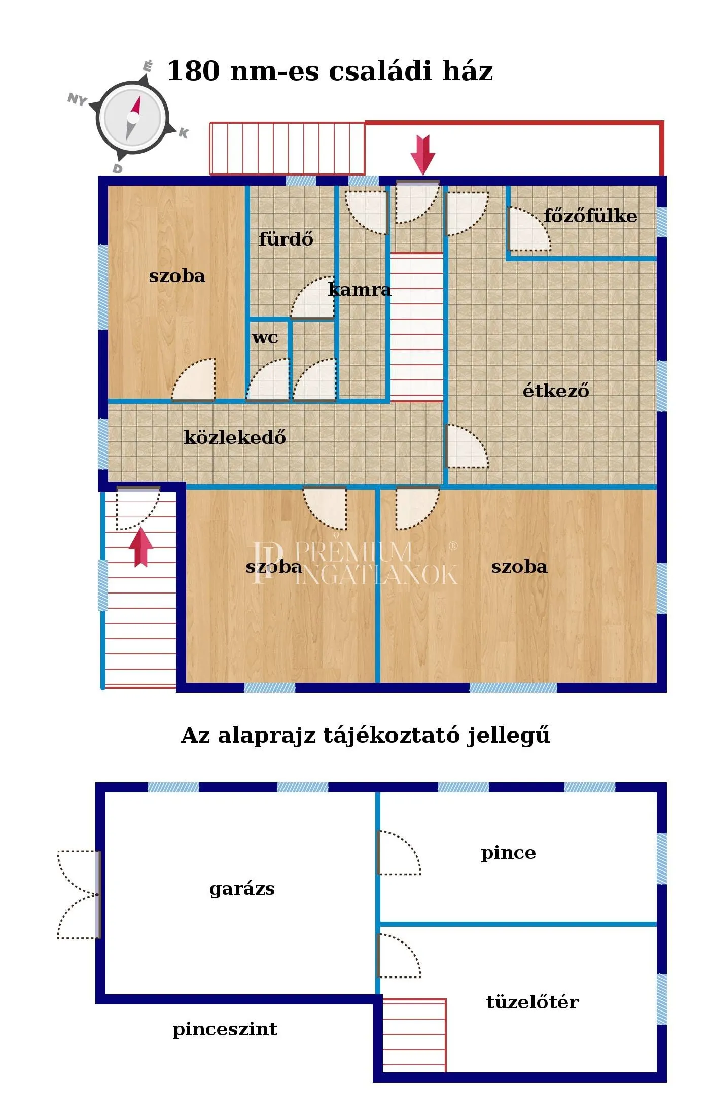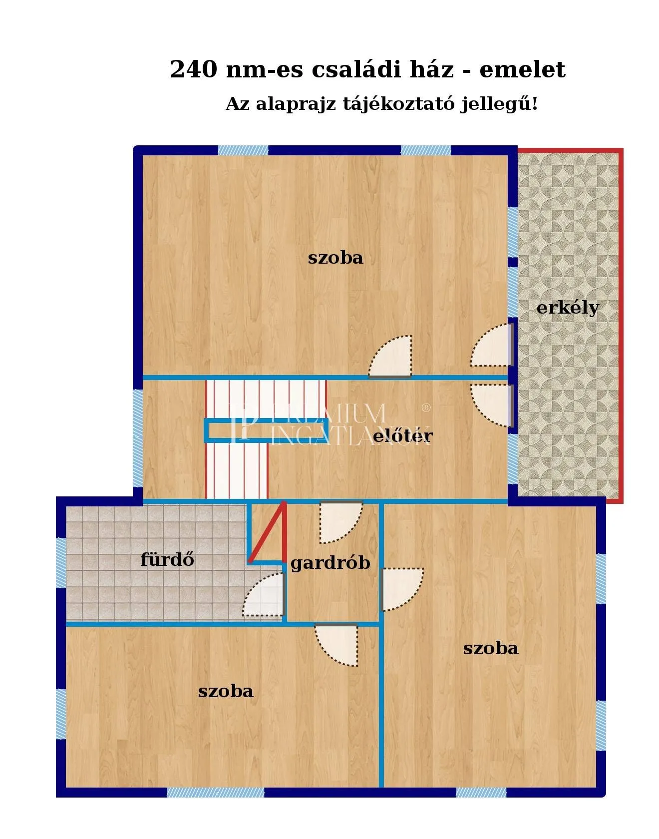 A 3838 nm-es telken található kettő, emeletes családi ház (a nagyobb 240 nm, a kisebbik 180 nm) is a vételár részét képezi. A 240 nm-es felújított családi ház (2 szint + beépített padlástér) 4 egész szobából, étkezős konyhából, 2 fürdőszobából, teraszból, erkélyből áll, a 180 nm-es, szintén emeletes családi házban 3 külön-nyíló szoba, 1 fürdőszoba, 1 terasz és 1 erkély található.
