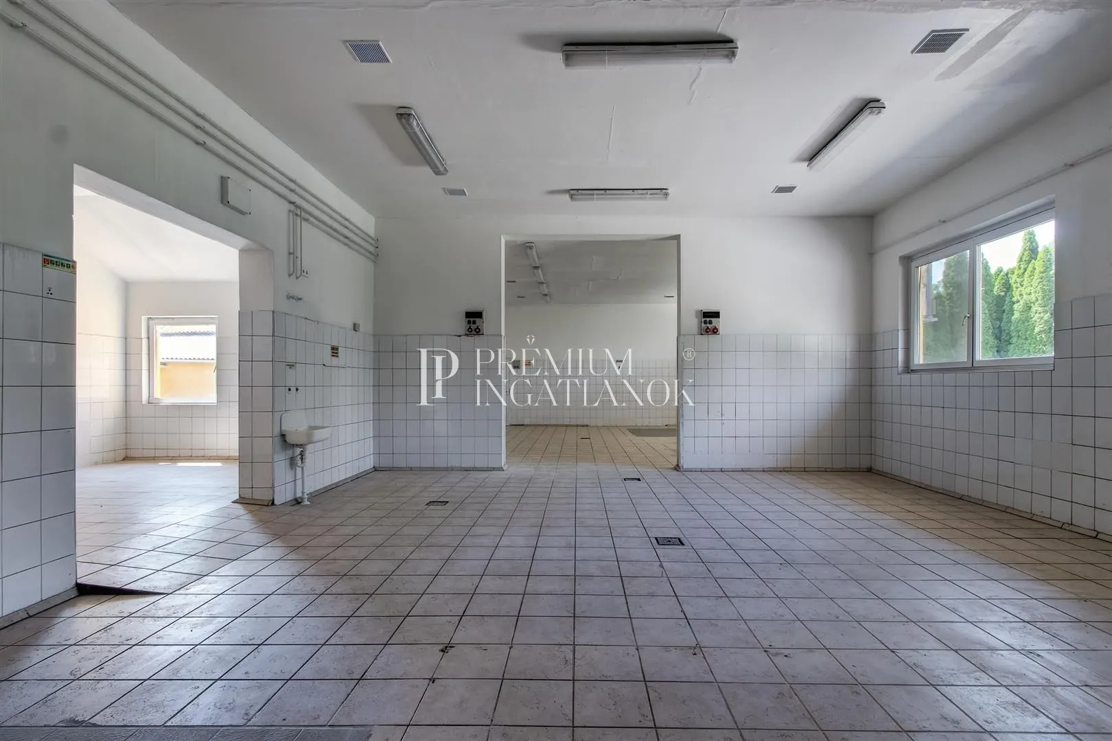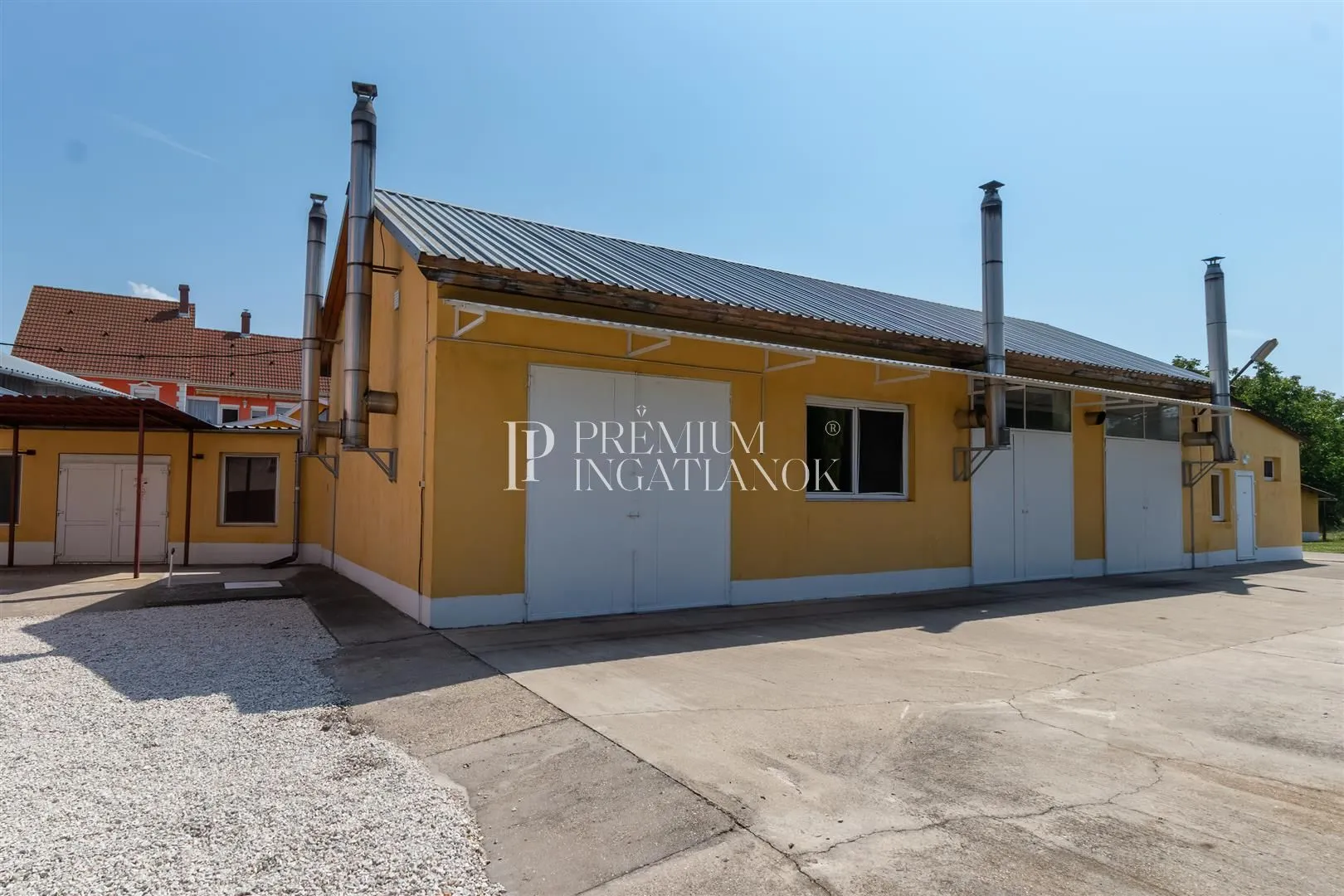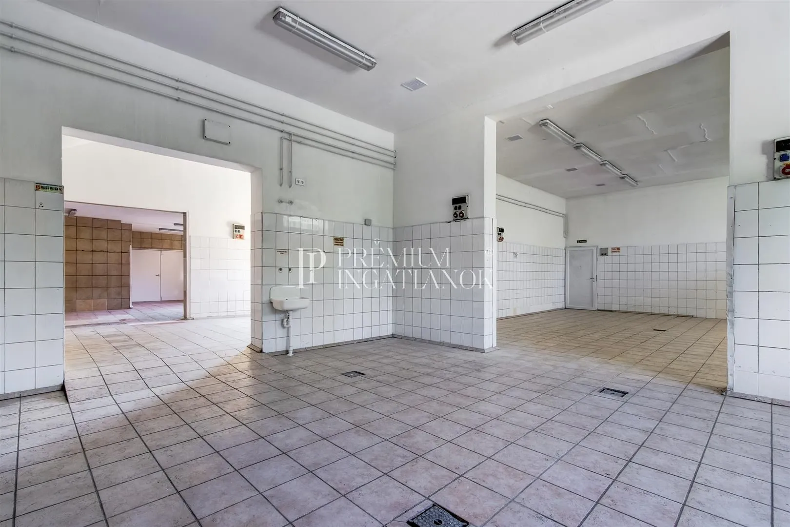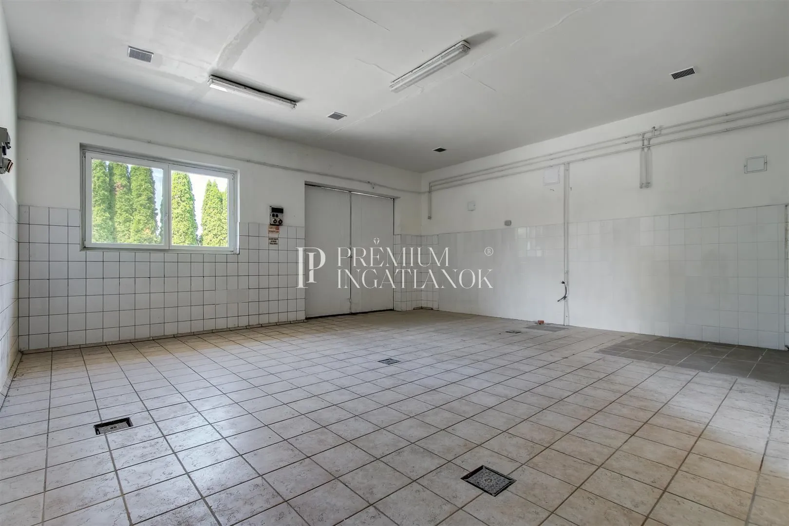 Az ipari ingatlan több részből áll és több irányból bejárható: összesen 1000 m2 összterületű ipari árammal ellátott összefüggő üzemépületet bejáróval, udvarral, felcsempézett üzem, raktár, 2 nagy és 2 normál raktár, több kisebb tárolóhelyiség, árukiadó épület és az egyik családi ház földszintjén található külön bejáratúmintabolt. A gondozott kertben úszómedence, jakuzzi, Botanikus kert található.